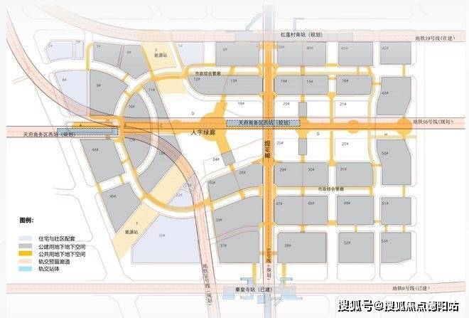 地下加密:在轨交站点、区域地标及商业中心间的主体步行空间设置了活力商业广场,布局文化、休闲、展示等公共服务功能;同时依托轨道客流构架慢行主线,以及地下独立车行系统及各物业单元的地下大堂、地下停车场系统互通互联,并通过简洁导引系统进一步完善交通。