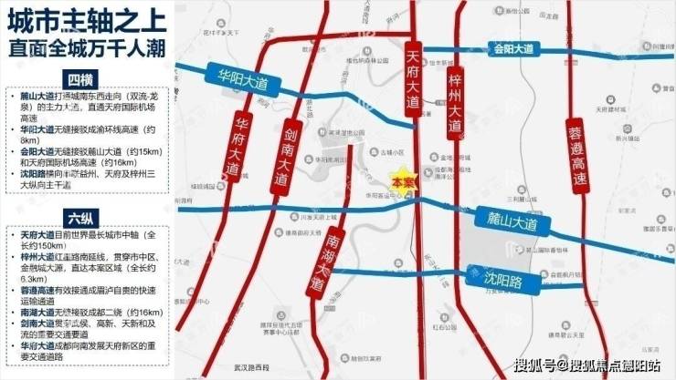 【四横六纵立体路网】【四横】:麓山大道、华阳大道、会阳大道、沈阳路【六纵】:天府大道、梓州大道红星路南延线、蓉遵高速、南湖大道、剑南大道、华府大道