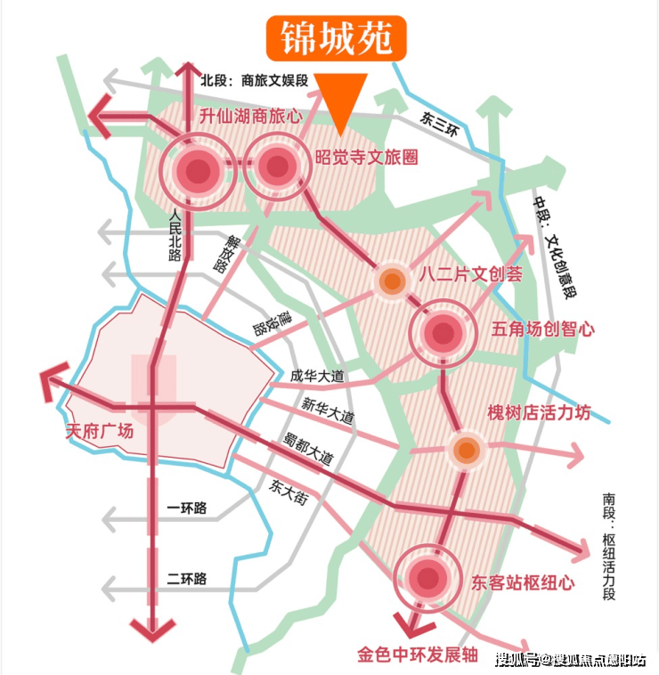 成华高质量发展的新动脉——串联成华区东客站TOD-东郊记忆商圈- CCD中央文创商务休闲区等城市核心节点,耦合都市文旅、数字创新、智慧服务、枢纽活力四大功能圈。