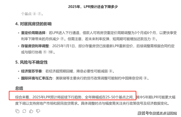 带着好奇,蓉妹用Deepseek也预测了下,得到的回复是:2025年LPR预计将延续下行趋势,全年降幅或在25-50个基点之间!(仅供参考哈)