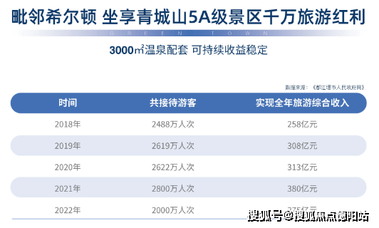 青城山做为全球旅游度假目的地,每年有近3000万旅游人次,全年旅游综合收入超300亿元,温泉酒店全年入住率超60%,近年,依托旅游利好,众多旅游产业投资进驻青城山。