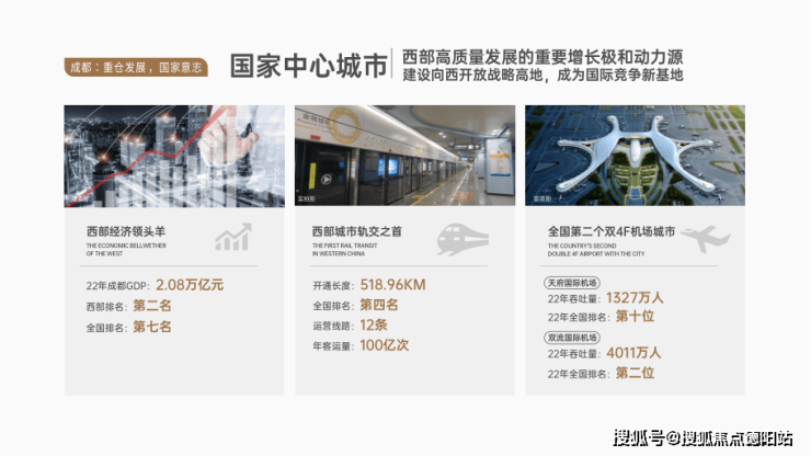 【世界顶级交通枢纽】城市候机楼:西南第一个双机场候机楼,每年超2000万人从这里出发;轨道交通:8规20站轨道交通,超越香港/东京大板/新宿世界最高轨道网络,实现成都境内外超2000万人口轻松抵达;天府新站:12台22线,实现1小时抵达全川,3小时抵达西部城市,8小时抵达全国