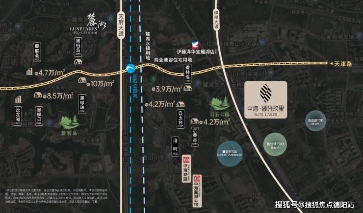 围绕“红石公园”而建的麓湖公园区,则是整个天府新区生态环境最为卓越的板块,是片区内最纯粹的高端居住区。