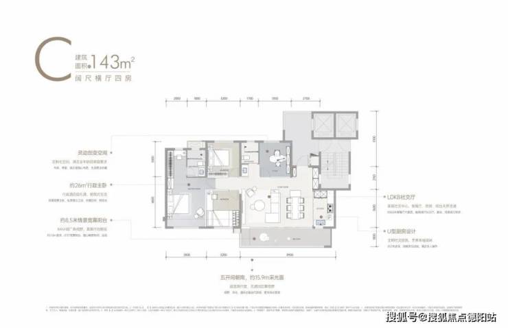 建面约143㎡的四房,同样为2T2私梯入户,各功能区空间堪称市面上最大尺度的143㎡,包括五开间朝南,景观阳台面宽达到8.9米,可享270度环幕视野,主卧双面观景,且所有卧室的面宽均在3.1米及以上等亮点!