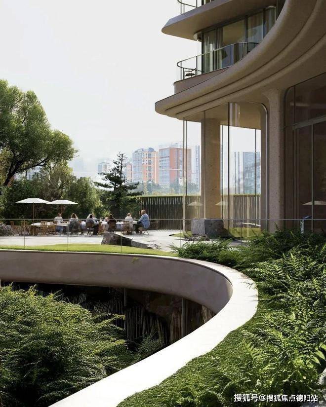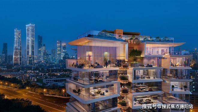 外立面摒弃传统玻璃幕墙,采用暖色仿石铝板与铜色栏杆,而最新调规后增加的玻璃比例进一步强化了“全景舱”视野。