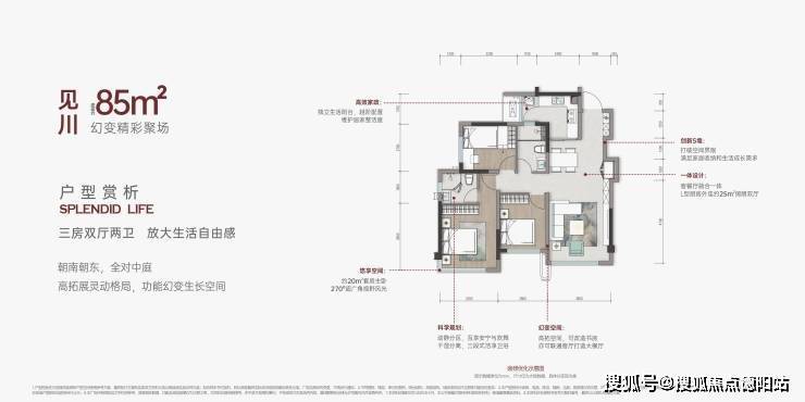 创新设计:LDK-R一体化方厅(餐客厨一体)+约6米双面宽阳台,增强家庭互动;