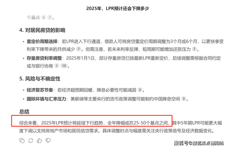 带着好奇,蓉妹用Deepseek也预测了下,得到的回复是:2025年LPR预计将延续下行趋势,全年降幅或在25-50个基点之间!(仅供参考哈)