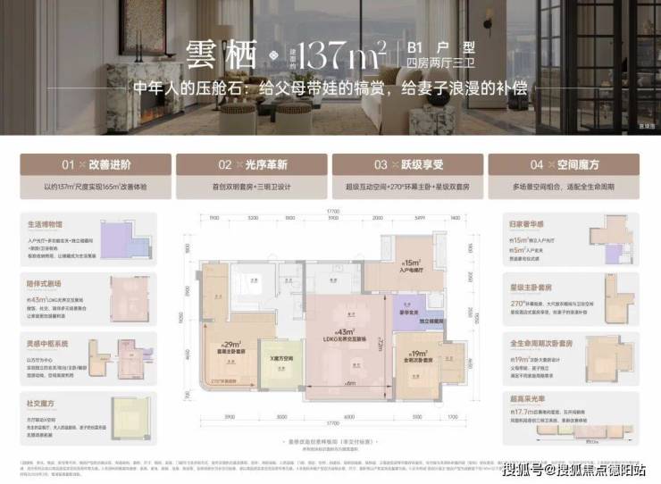 双套房+三明卫配置,既满足老人同住需求,又保障代际隐私;约43㎡客餐厅+X魔方空间,可随时切换为亲子游戏区、居家办公区或临时客房;约29㎡主卧套间,用独立衣帽间实现真正的"男女主人平权"
