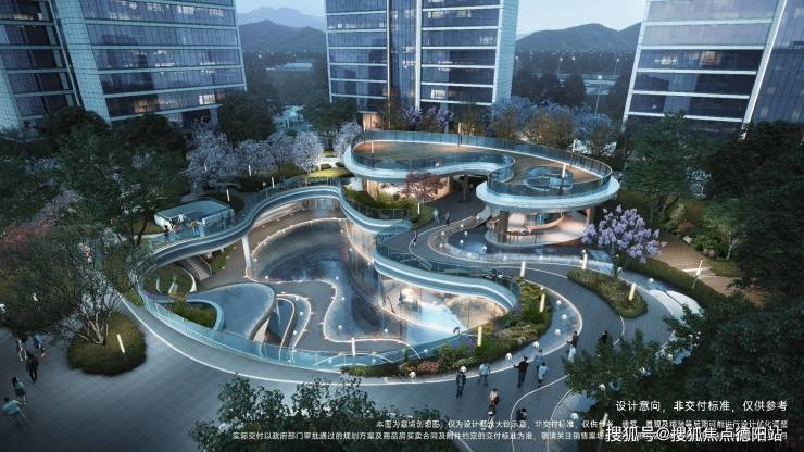 ·水翼流芯:景观设计整体形态,取境东安湖城市向往,以微流体象征水系流动韵律