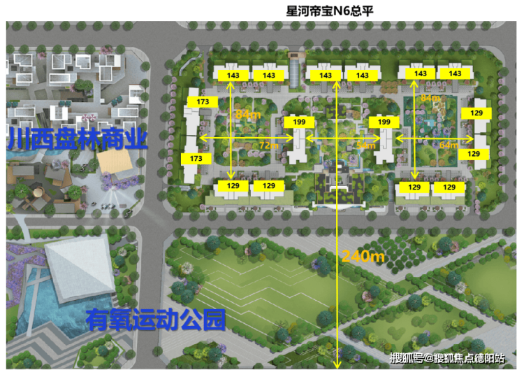 2、采用大围合布局,形成三中庭园林,100%户户瞰景最小都有64米以上楼间距,最大超240米无敌视野,没有任何一栋楼存在视野遮挡。