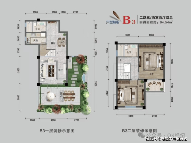 二跃三:实得94㎡,花园20-30㎡