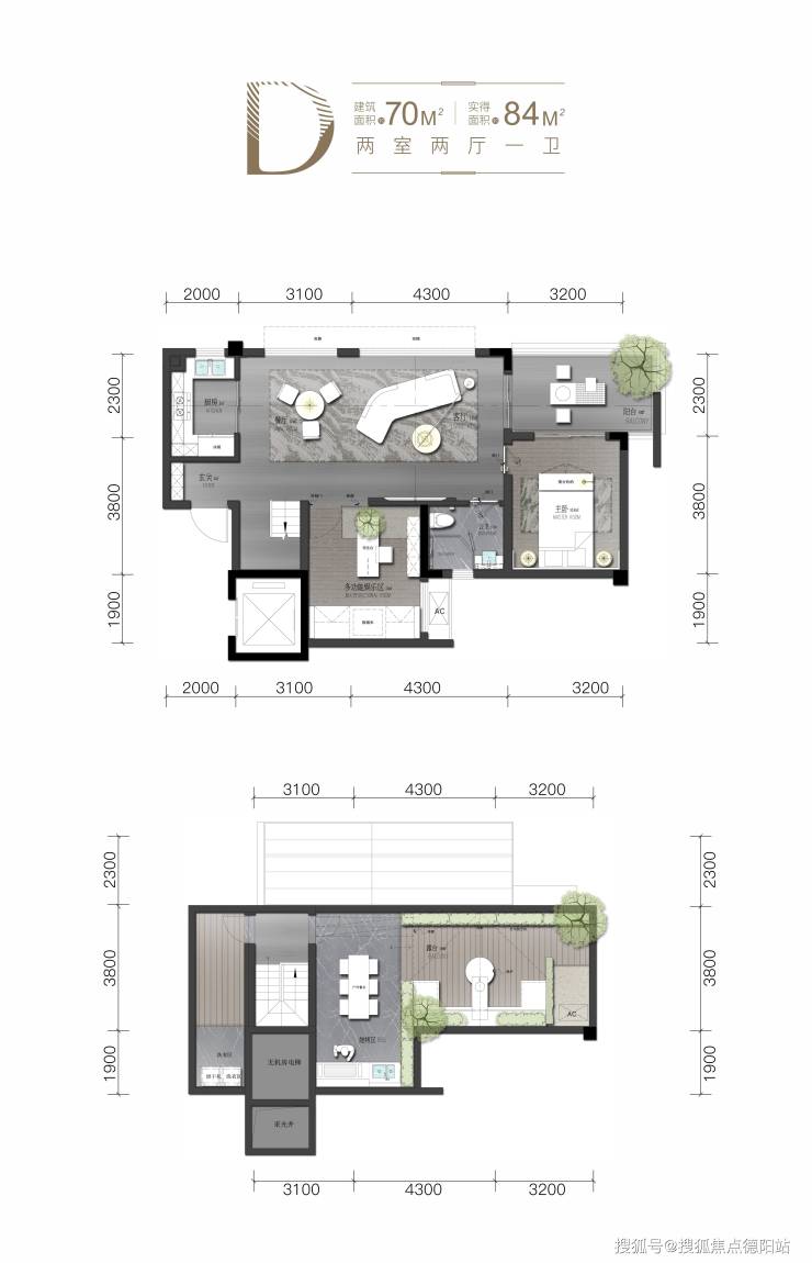 四楼:D:建面约70,实得84左右两室两厅一卫+露台+屋顶花园。后期可加精装包