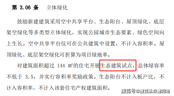 对建筑面积超过 144 ㎡的住宅开展生态建筑试点,总体绿容率不低于 3.5,并实行容积率奖励政策。生态阳台不计入板户比,不计入容积率,不计入该套住宅产权建筑面积。