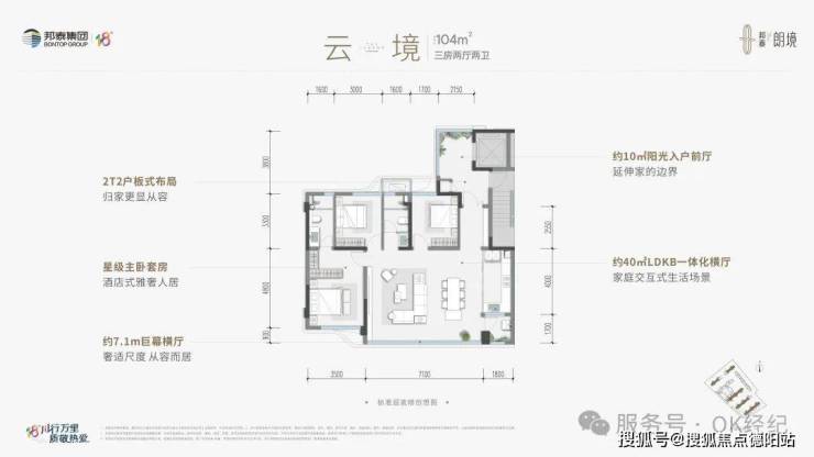 •建面约104㎡ 云境 三室两厅双卫(清水)2T2户纯板式布局,约11㎡阳光前厅私梯入户,约7.1m开间巨幕横厅,星级主卧套房