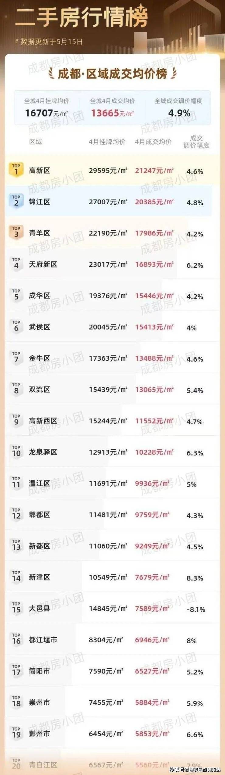 当然,二手房的价格平稳仅仅只均价,随着行情的高涨,不同区域版块之间的价差也逐渐明显,核心城区尤其是高新南、锦江区、成华区等挂牌价和成交均价都呈现出价上涨的趋势。
