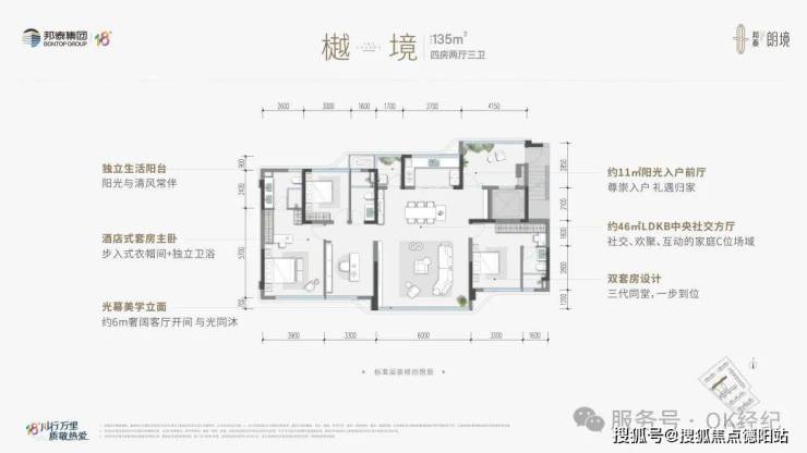 •建面约135㎡ 樾境 四室两厅三卫+双套房(精装)光幕美学立面,酒店式套房主卧,双套房设计,中央社交方厅