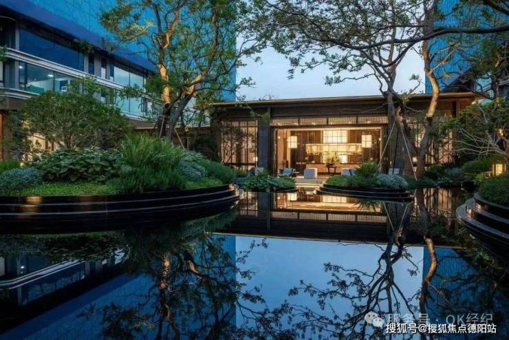 约110m 仪式美学中轴 ,3 条生活归家轴线,以镜面水景为主铺陈水景的「湖镜」「涌泉」「叠水」「流瀑」四种形态,设置环绕式水上会客厅、水中浮岛、单元迎宾水景,以现代酒店度假为基础,融入现代时尚元素,打造定制级的自然景观。