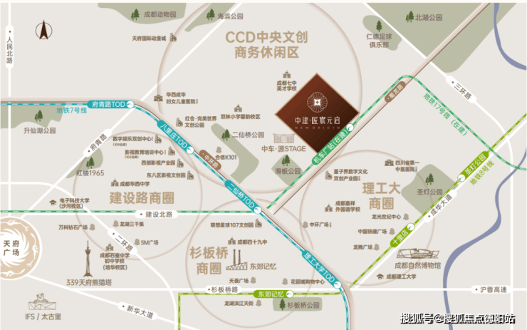 项目择址二八板块——成都"中优"战略中三环内唯一的副中心(八里庄中心),被明确定位为"中央文创商务休闲区(CCD)"。目前该区域已汇聚七大文创产业集群及600余家优质企业,形成强大的产业辐射效应。占据金色中环与成华大道双轴交汇的黄金区位,这里正加速整合产业、教育、商业、居住四大城市核心要素,构筑成都东部新兴发展极核。