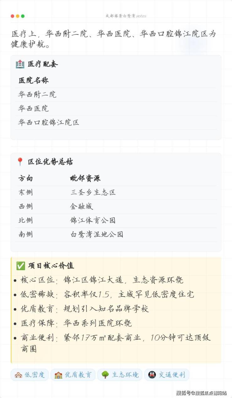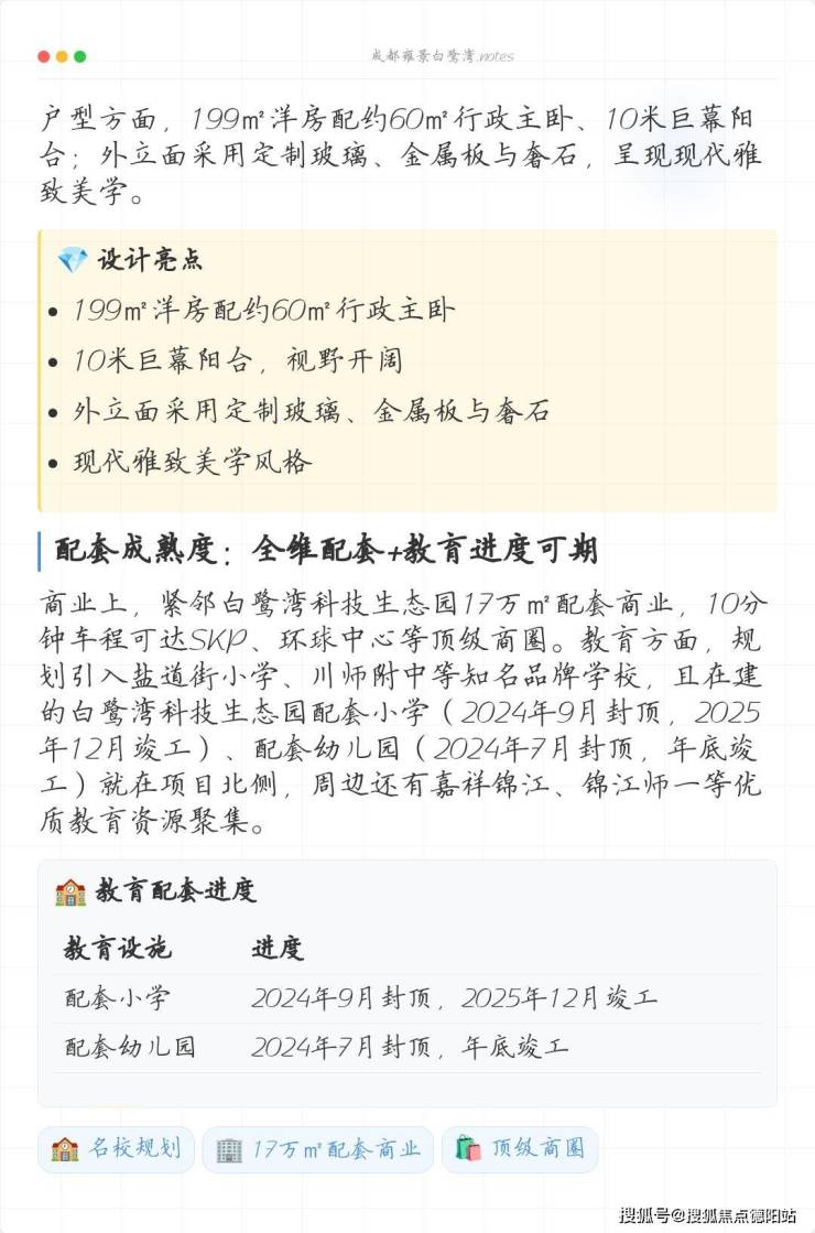坐落于锦江区白鹭湾四街199号的雍景白鹭湾,地处白鹭湾板块核心区域,项目总占地面积约100亩,容积率控制在1.5。整个社区规划为三个独立地块:1号地"锦府"与2号地"锦院"为6层洋房产品,而毗邻江家艺苑生态绿地的3号地"锦墅",则规划为4-5层纯叠墅群落。