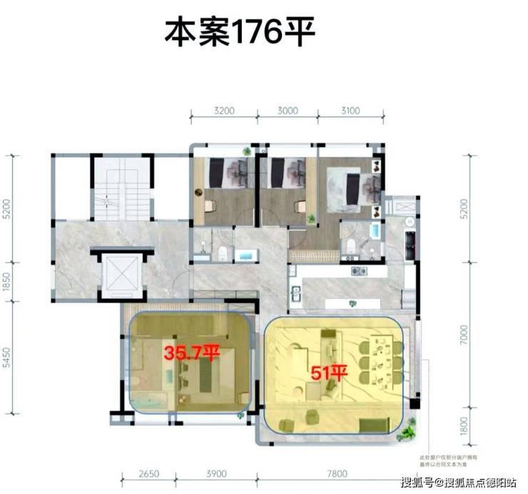 ?️ 空间布局:176平米户型的空间布局非常合理。电梯前厅约4平米,全明设计;客厅约51平米,开间7.8米,端户采用L型采光设计;主卧约36平米,开间6.55米。在市面上180平米左右的户型中,这个设计尺度相当不错。