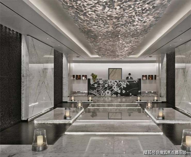 3、五星级入户大堂,地面全大理石水刀拼花、墙面敢挂石材,镜面不锈钢硬包及金属镜面造型,菁装首层入户大堂,入户大堂约6米挑高,定制水晶吊灯,精雕细琢入户仪仗,用心铺排,动静相间营造极具尊贵的舒适体验