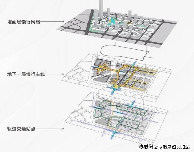 地下加密:在轨交站点、区域地标及商业中心间的主体步行空间设置了活力商业广场,布局文化、休闲、展示等公共服务功能;同时依托轨道客流构架慢行主线,以及地下独立车行系统及各物业单元的地下大堂、地下停车场系统互通互联,并通过简洁导引系统进一步完善交通。