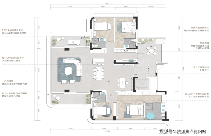 3.3m奢阔层高,纵深采光无死角;在此空间之上,实现4房4卫4套房:60㎡双主主卧套+18㎡次卧套+13㎡客卧套+X动线空间联动。