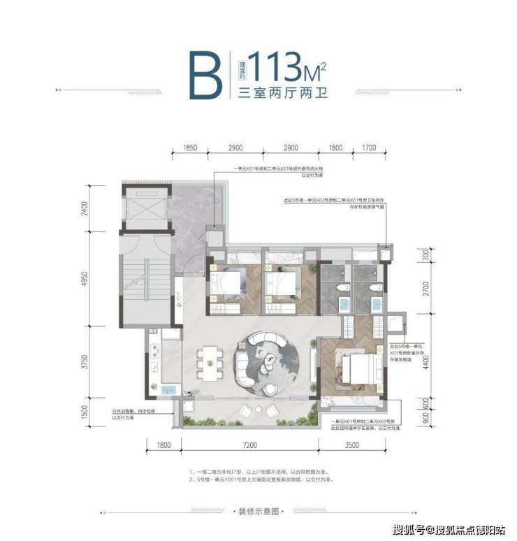 项目标准层户型共有两款:建面约113㎡套三双卫、建面约127㎡套四双卫。