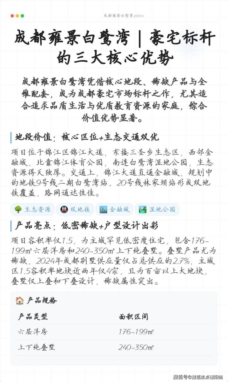 坐落于锦江区白鹭湾四街199号的雍景白鹭湾,地处白鹭湾板块核心区域,项目总占地面积约100亩,容积率控制在1.5。整个社区规划为三个独立地块:1号地"锦府"与2号地"锦院"为6层洋房产品,而毗邻江家艺苑生态绿地的3号地"锦墅",则规划为4-5层纯叠墅群落。