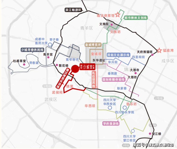 宽窄巷子、青羊宫、武侯祠等世界知名景区林立,人民公园、成都博物馆、省图书馆等文化、休闲配套环伺。千万级游客量(数据来源 :青羊商务公众号)为项目产品提供了丰富的运用场景和源源不断的财富动力。