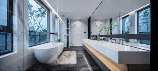 一层约56㎡的奢阔横厅,以超11米大开间+近8.5米巨幅观景窗消融室内外界限,阳光与风景自由流动。地面铺设马可波罗凌霄灰仿石材砖,天然石纹肌理在足下延伸;墙面甄选烟雨江南主题陶瓷岩板,如水墨长卷铺展,共同构筑兼具艺术格调与烟火气的家庭欢聚殿堂。无论是深夜影院时光、节日三代同堂盛宴,抑或孩子与宠物的奔跑嬉戏,皆在此从容上演。