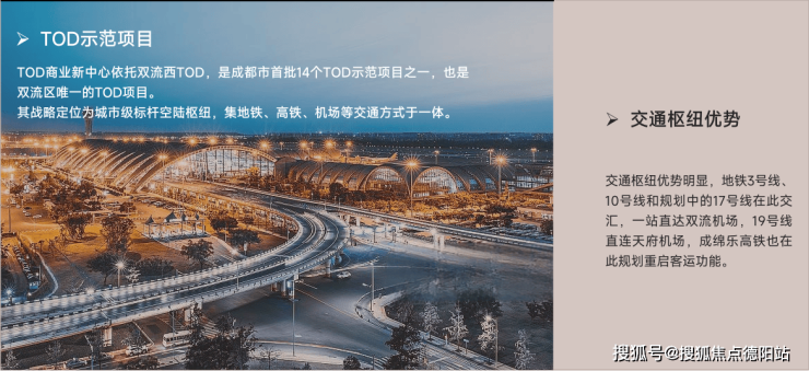定位:城市级标杆型未来空陆枢纽,项目是处于TOD空港产业示范区核心位置,汇聚3/10/17(规划)三条地铁线路,成绵乐高铁站、公交车交通枢纽站及双流国际机场。