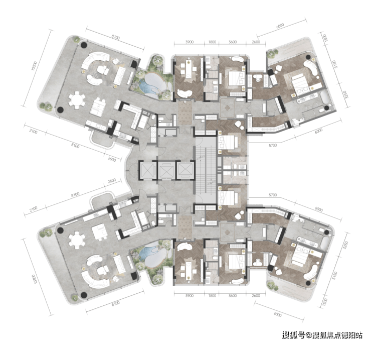 在产品户型方面,贝宸S1最大亮点是阳台的设计,通过“1+3”阳台的设定,开启“生态舱”内的功能模块。以主力户型建面约375㎡产品为例,该户型创造性地规划了1个约20㎡的空中花园+3大阳台的“生态支点”,4个阳台总面积约53㎡,占到整体单户空间的13%,这在成都乃至全国同级别面积段的户型中,相当少见。