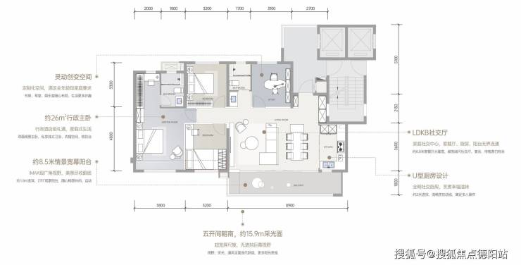 【LDKB社交厅】约6.9米大面宽客餐厅与厨房、阳台无界连通