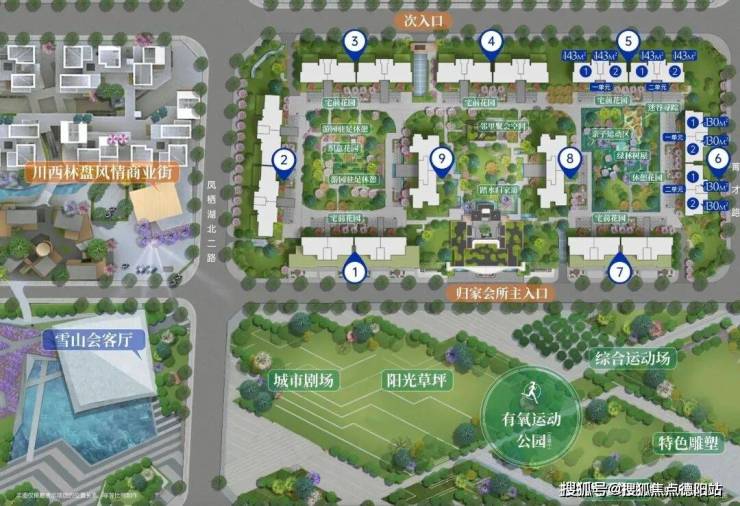 2、采用大围合布局,形成三中庭园林,100%户户瞰景最小都有64米以上楼间距,最大超240米无敌视野,没有任何一栋楼存在视野遮挡。