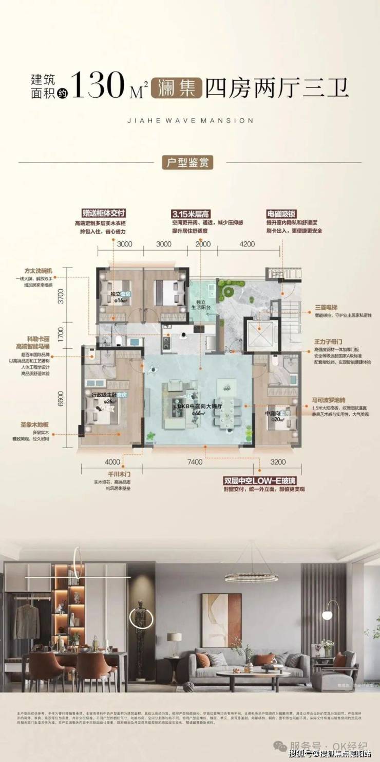 LDKB一体化,连接超7m宽中庭向大面宽阳台,全景落地窗,视野开阔