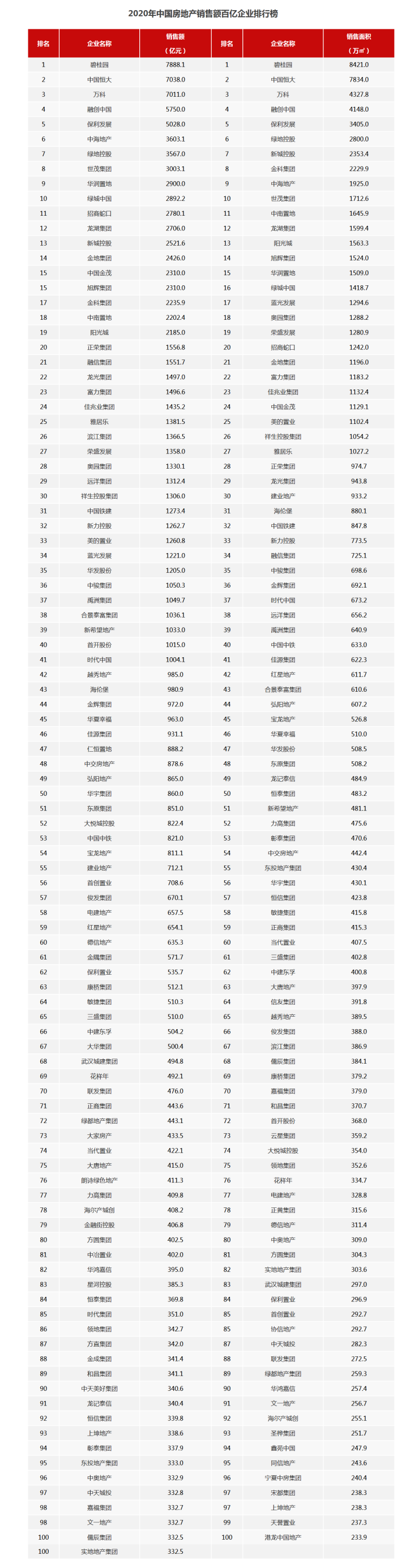 2020年,全国商品房销售实现平稳增长。根据中指研究院监测显示,2020年共计166家房企跻身百亿军团,销售额平均增速为14.4%;百亿企业的权益销售额共计10.7万亿元,市场份额约61.8%。此外,2020年,TOP3房企门槛值为7011亿元,TOP10房企门槛值为2892亿元,分别较上年提升749亿元、467亿元。