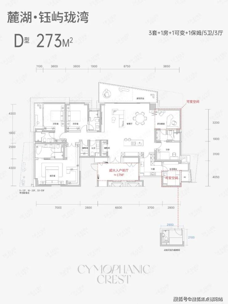 D户型有着超大的电梯入户前厅,在3个套房基础上,还做了一个可变套房的设计,此外还增设了工人房以及丰富的独立储藏空间。