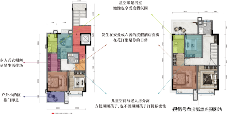 动静分层设计,二楼蜜月套房式主卧,步入式衣帽间+开放式露台,随时可以和爱人看着星空小酌一杯,属于二人的私有浪漫,每一个居家日常,皆如度假酒店的放松时刻。上下叠儿童房均和长辈房分离,在照顾孩子的同时,亦可享受安静私密的休憩。