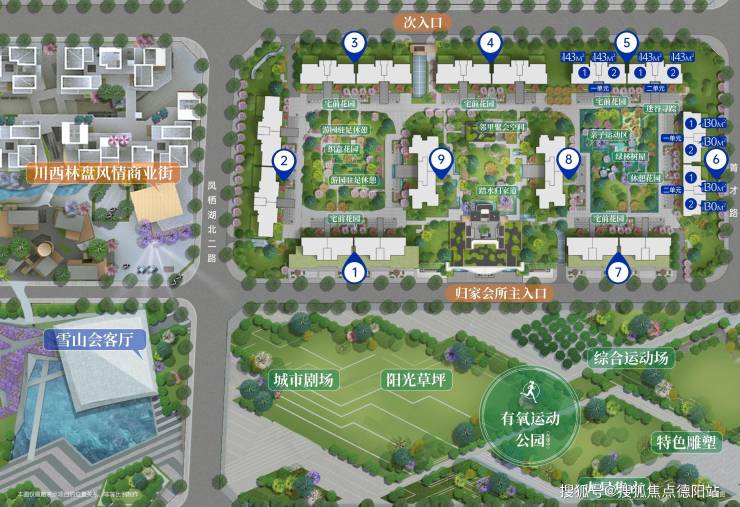 2、采用大围合布局,形成三中庭园林,100%户户瞰景最小都有64米以上楼间距,最大超240米无敌视野,没有任何一栋楼存在视野遮挡