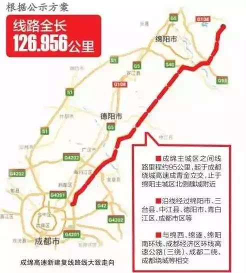 项目起于绵阳市,后经德阳市旌阳区、广汉市至青白江区,上跨成都第二绕城高速公路后,经青白江铁路港,与成都绕城高速公路交叉,接成都市二环、三环等城市干道。并将在成都一绕-二绕段既有的成青金快速路上设置高架桥。其中,成绵高速扩容线德阳至成都止点段全线高架,广汉境内长15.1公里,双向八车道,3个全互通立交和1个开放式服务区。