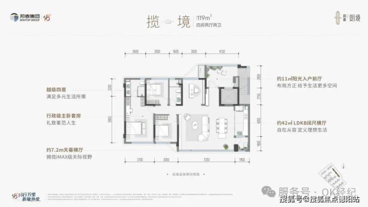 •建面约119㎡ 揽境 四室两厅双卫(精装)越级四居,约7.2m天幕横厅,行政级主卧套房