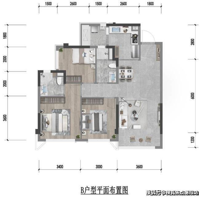 建面约93㎡三房双卫各个空间的尺度不输现在市面上110㎡面积段户型。