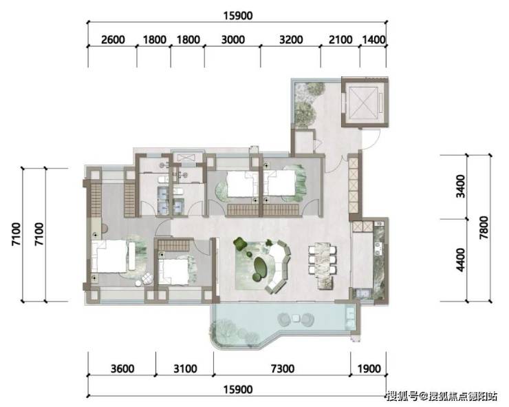 除了有一个卫生间是暗卫以外,这个户型可以说是相当完美了。