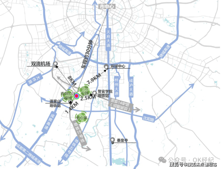 双地铁:地铁19号线(温江山站直线距离约1.4KM),地铁5号线(警官学院站直线距离约2.3km),未来规划地铁14号线&地铁20号线从项目附近经过