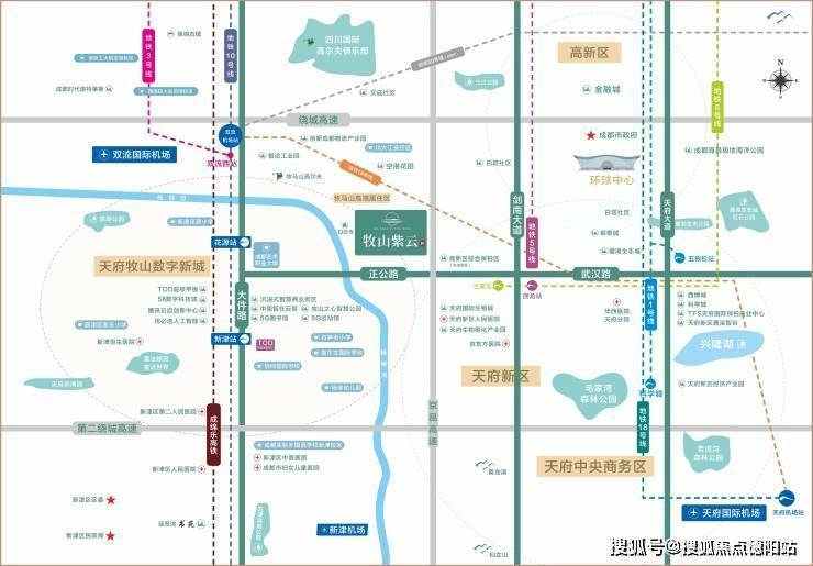 - **丰盛城市场域,便捷触手可及** - **立体交汇路网体系,链接繁华**:项目拥有三纵两横棋盘式交通路网。三纵分别为大件路、成淪环线高速、剑南大道;两横是天保大道(在建)、正公路。距地铁 10 号线花源站约 1 公里,距公交站约 300 米,出行十分便捷。 - **高端教育资源,起步锦绣前程**:周边私立学校云集,有墨尔文学校、成都新津为明学校、成都实验外国语新津校区,还有在建的成都嘉祥天府牧山校区。公立学校方面,有成都市石笋街小学新津校区,为孩子提供优质教育资源。 - **成熟生活配套,全消费立体场景**:区域级配套有 TOD 繁华生活圈(TOD 创智活力综合体、E 商坊(在建中))、优博桃花源;城市级配套包含建设中的成都大悦城购物中心、山姆会员店、天府国际保税商业中心,满足您全方位的消费需求。 - **周边公园/休闲配套**:项目自身规划有滨河休闲公园、园区后花园;区域内有云谷公园、项目北侧规划公园;城市级配套有占地 1500 亩的四川国际高尔夫俱乐部,它是四川第一家高尔夫球会,还有空港花田等,让您尽享休闲时光。 - **优质医疗配套,时刻守护健康**:周边医疗资源丰富,新津中医院花源分院距离项目仅 1 公里且已开院;四川大学华西天府医院约 25.4KM,是三级甲等公立医院且已开院;成都万达国际医院约 23.6KM,作为国际医院预计 2022 年投入运营;成都市第七人民医院天府医院约 11.8KM,同样是三级甲等公立医院且已开院;还有四川省骨科医院天府新区医院。### 项目规划牧山紫云轩项目尽显纯粹圈层格调,还获得政府背书。它是新津区 2024 年一季度 32 个重大项目之一,用地性质为商业用地。项目总投资额达 1.5 亿,总占地约 13 亩,精心打造别墅、大平层、跃层三种产品,共计 56 户,配备 113 个车位。容积率小于 1.9,建筑密度 38.28%。其中跃墅大平层,专为极少数人定制。