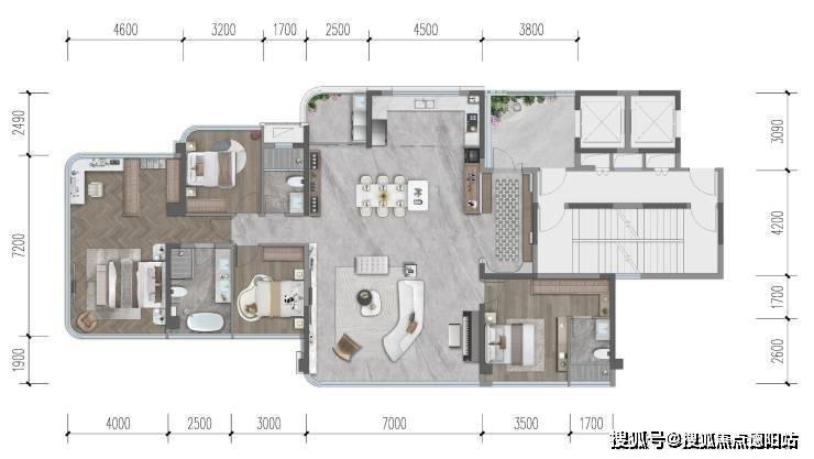 ▌明星户型③:建面约189㎡四房两厅三卫(高层)· 楼尊视野 中庭楼王位置,尽享小区最佳中庭景观和超大楼间距,南北朝向,采光通风俱佳· 社交方厅约76㎡LDKB中央社交方厅,满足社交、聚会等场景,开放式中西厨+灵动导台· 越级享受开间超7米,媲美市场上250㎡豪宅尺寸感,超大会客厅尽显豪宅气派· 光厅入户约12㎡光厅入户,独立拼花玄关,双侧收纳空间,满足全家需求· 中西双厨厨房约4.5米超大开间,U型设计,中西厨联动,布局合理,尺度开阔· 星级套房星级双套房设计,洞悉家庭多元所需,约42㎡环幕主卧超大套房,行政级衣帽间尽显尊贵,独立式浴缸礼致峯范人生· 超大空间实际可利用空间约建筑面积的103%