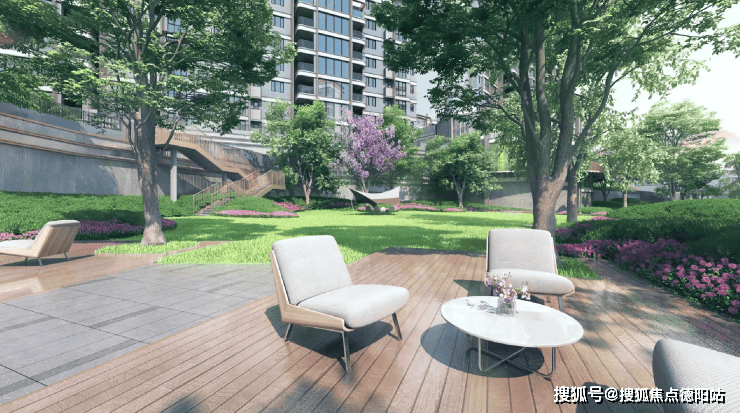 一台——半隐疏林:约1000㎡露营空间,主题植物树种蓝花楹,大片的疏林草地空间结合休憩平台,为住户提供一个林下休闲的场所。