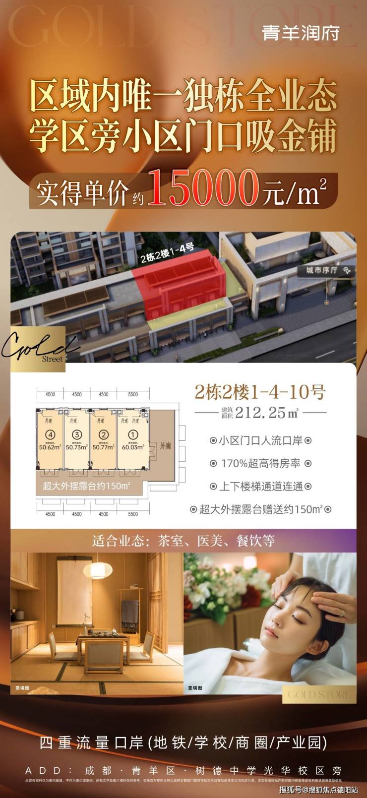青羊润府「金」铺专为高净值人群的日常消费打造。西门人与南门偏好 Mall 不同,他们更钟情于街区。然而,环顾周边三公里范围乃至整个城西区域,能够担当城西人高阶社交目的地的商街少之又少。青羊润府·情景式花园商铺则别具一格。它临近三条地铁线路,即地铁 9 号线、13 号线以及 4 号线中坝站 ,且位于高端居住区域。作为社区商铺,凭借高阶审美力与极致产品力,为高净值人群的日常消费提供服务。