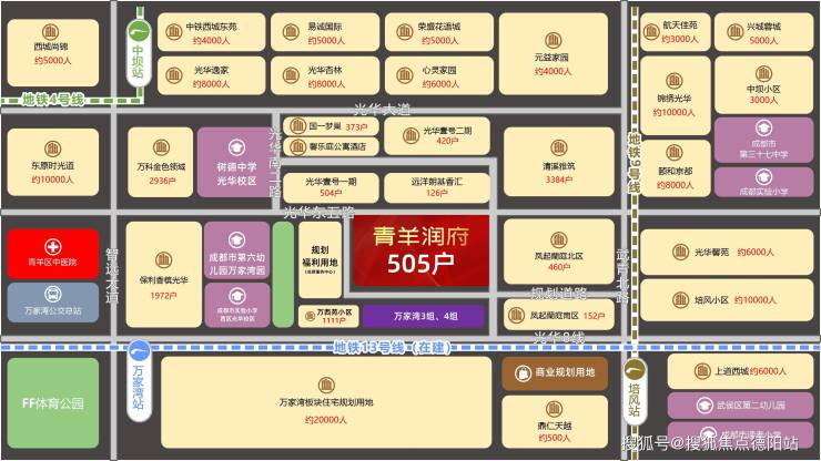 以项目为中心,项目自带超约2000高消费人群,同时项目东侧紧临绿城凤起南庭约5000多人,北侧紧邻光华一号花园约5000多人,远洋朗基香汇约1000人,清溪雅筑约10000多人,西侧紧邻树德中学,成都实验小学约5000在校师生,还要待建社区配套用地,预计3000多人。